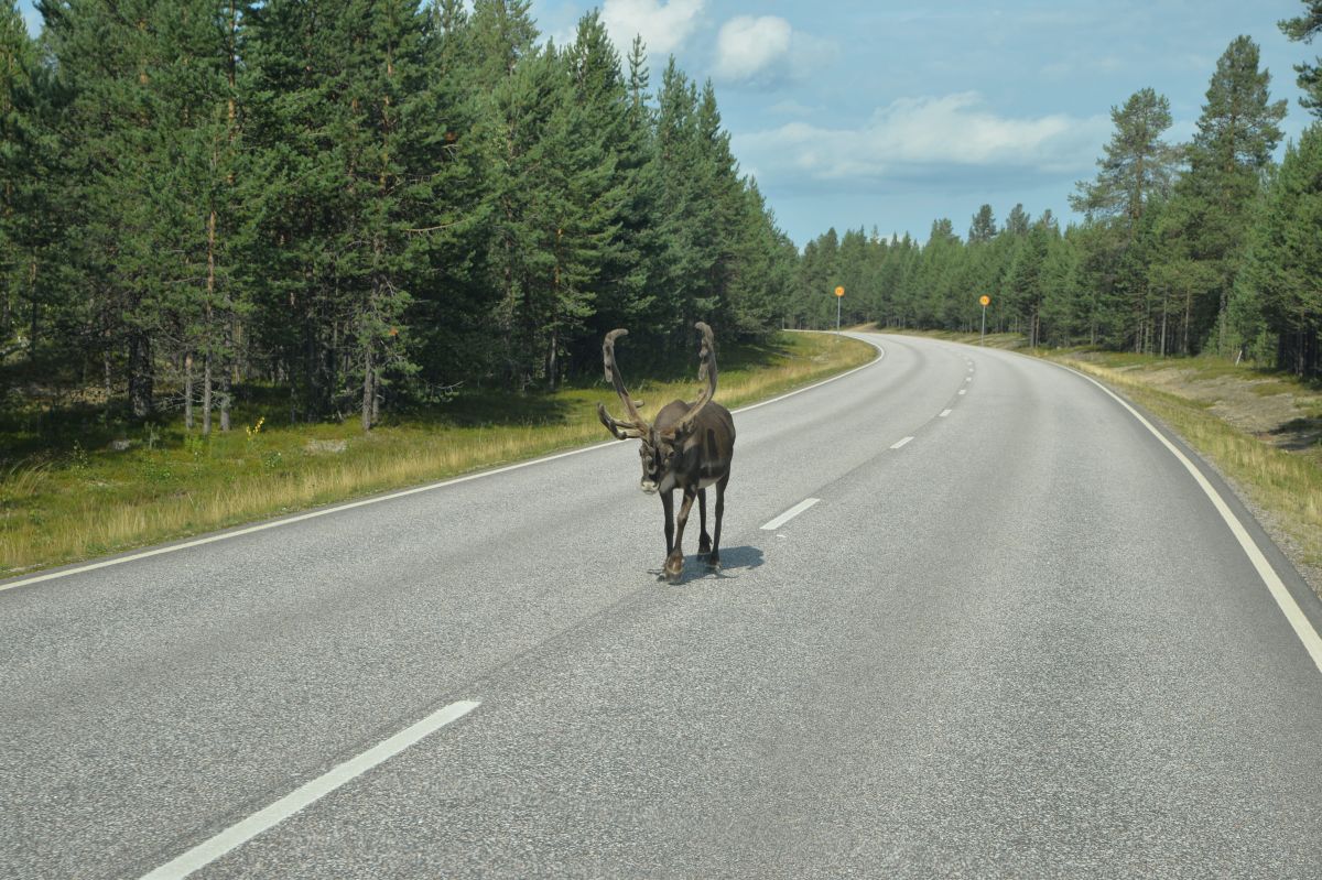 Auf dieser Straße begegnen wir nun zahlreichen Rentieren an und auf der Straße. Wir übernachten auf dem sehr großen Arcus Camp